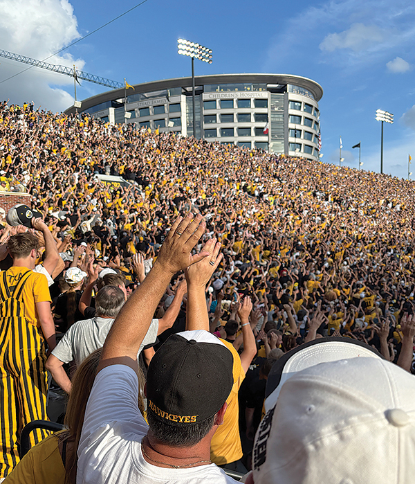 The 70,000 fans along with players, coaches and staff for the Hawkeyes and the visiting team turn toward the hospital and wave to the pediatric patients and parents gathered on the top floor that provides a bird’s-eye view of the field. The children wave back and hold up handmade signs.