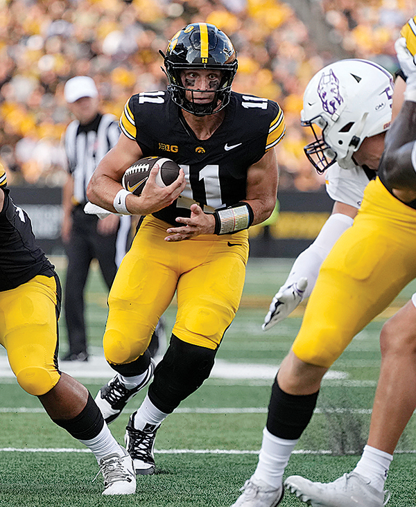 AP PHOTO - Iowa quarterback Mark Gronowski (11) carries the ball up field during the first half of a college football game against Albany on Saturday at Kinnick Stadium in Iowa City.