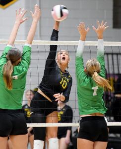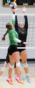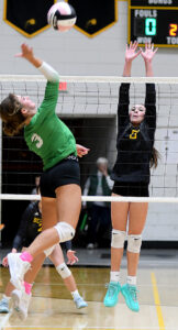 - T-R PHOTO BY ROSS THEDE – BCLUW senior Leah McEwen (6) tries for the block against FAith Shirbroun of Fort Dodge St. Edmond during Monday’s regional semifinal volleyball match in Conrad.