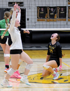 - T-R PHOTO BY ROSS THEDE – BCLUW junior middle hitter Kylie Pekarek (14) celebrates after her first of back-to-back blocks against Fort Dodge St. Edmond during Monday’s Class 1A Region 8 semifinal volleyball match in Conrad. The sixth-ranked Comets swept the Gaels 25-17, 25-21, 25-22.