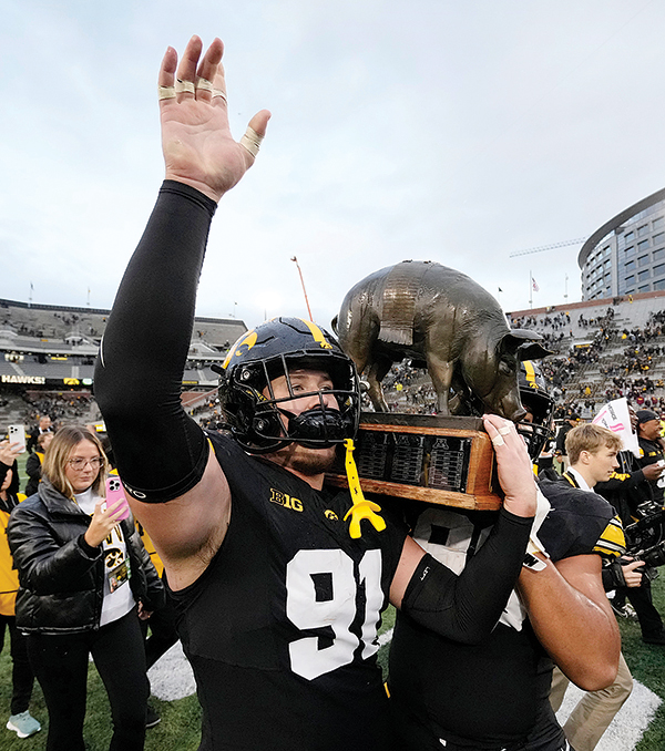 AP PHOTO - Iowa defensive lineman Jonah Pace (91) celebrates with the Floyd of Rosedale trophy after Saturday’s Big Ten football game against Minnesota at Kinnick Stadium in Iowa City. The Hawkeyes won 41-3.