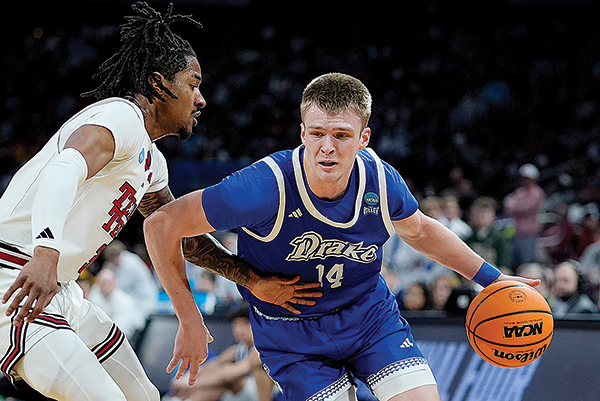 AP FILE PHOTO - Drake guard Bennett Stirtz (14) drives under pressure from Texas Tech guard Elijah Hawkins, left, during the first half of the second round of the NCAA college basketball tournament March 22 in Wichita, Kan.