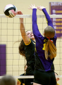- T-R PHOTO BY ROSS THEDE – West Marshall’s Arya Wertz, left, goes up for the attack against East Marshall during Monday’s Class 2A Region 5 first-round volleyball match in Le Grand. Wertz had a team-leading nine kills in the Trojans’ season-ending defeat.