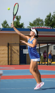 - T-R FILE PHOTO – Marshalltown junior Kate Sandvick hits an overhand smash at the net during her Class 2A Region 5 quarterfinal against Sydney White of Urbandale on Sept. 17 at the Marshalltown Court Complex. Sandvick defeated White 6-2, 6-2, to advance to the regional semifinals.