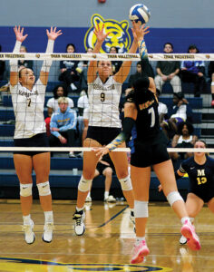 - T-R PHOTO BY ROSS THEDE – Marshalltown Community College defenders Imigyn Stratton, far left, and Morghan Harvey (9) try for the block as Hawkeye’s Ruby Patterson attacks the volleyball during Wednesday’s match at MCC.
