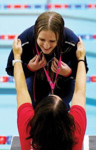 - T-R PHOTO BY ROSS THEDE – Marshalltown sophomore Adele Beek is adorned with her regional championship medal by head coach Angie Nelson after winning the 100-yard breaststroke at Saturday’s meet at the Marshalltown YMCA/YWCA.