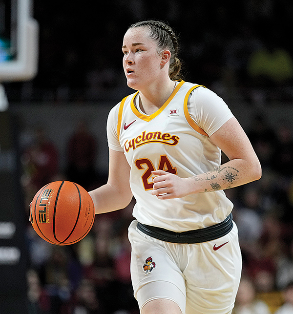 AP FILE PHOTO - Iowa State forward Addy Brown dribbles up court during the second half of a college basketball game against Drake on Nov. 24, 2024, at Hilton Coliseum in Ames.