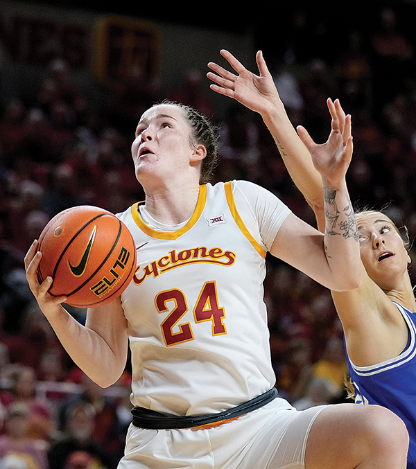 AP FILE PHOTO - Iowa State forward Addy Brown (24) drives to the basket in front of Drake forward Courtney Becker, right, during the second half of a college basketball game Nov. 24, 2024, at Hilton Coliseum in Ames.