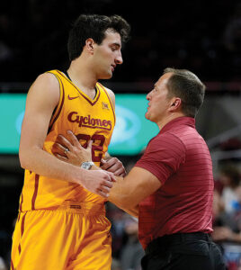 AP PHOTO - Iowa State men’s basketball coach T.J. Otzelberger talks with forward Milan Momcilovic (22) during the second half of a college basketball game against Fairleigh Dickinson on Monday at Hilton Coliseum in Ames.