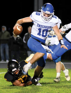 - T-R PHOTO BY ROSS THEDE – West Marshall’s Beckham DeSotel, lower left, trips up Underwood quarterback Garrett Luett (10) during Friday’s Class 1A state football playoff game in State Center.