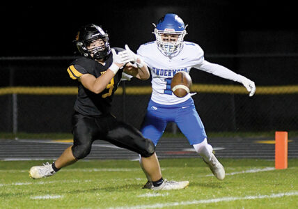 - T-R PHOTO BY ROSS THEDE – West Marshall’s Kinnick Geers, left, reels in a pass in front of Underwood’s Hudson Ross (6) for 13 yards during the third quarter of Friday’s Class 1A state football playoff game in State Center.