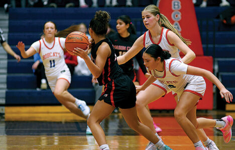 - T-R PHOTO BY ROSS THEDE – Marshalltown defenders Morgan Hilderbrand, front right, Jorja Janssen and Kinsley Bowie (11) try for the steal during the second half of Friday’s game against Mason City at the Roundhouse. The Bobcats have the top-ranked defense in all of Class 5A, allowing just 23.67 points per game.