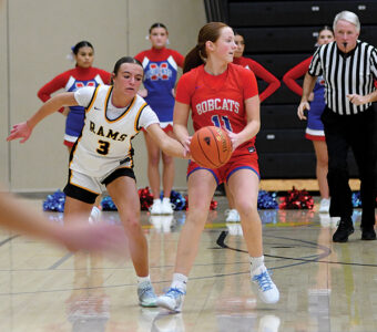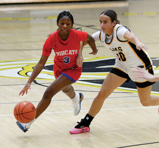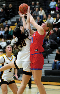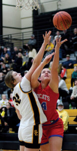 - T-R PHOTO BY ROSS THEDE – Southeast Polk’s Elyse Bartels, left, blocks a layup attempt by Marshalltown’s Amairra Johnson (3) during the first half of Monday’s non-conference basketball game in Pleasant Hill. The Rams racked up a 59-28 victory to deliver the Bobcats’ first loss of the season.