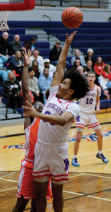 - T-R PHOTO BY ROSS THEDE – Marshalltown senior Jacob Hayes scores over Council Bluffs Jefferson defender Demari Robinson on his way to a career-high 19 points in Friday’s game at the Roundhouse.