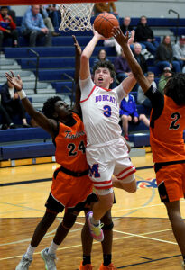 - T-R PHOTO BY ROSS THEDE – Marshalltown senior Jacob Hayes (30) drives to the basket past Waterloo East defenders Quayshon Harrington-Johnson (00) and Jadyn Perkins (2) for a layup during the first half of Tuesday’s Iowa Alliance Conference basketball game at the Roundhouse. Hayes had a game-high 17 points as the Bobcats remained unbeaten in conference play with a 45-34 victory over the Trojans.