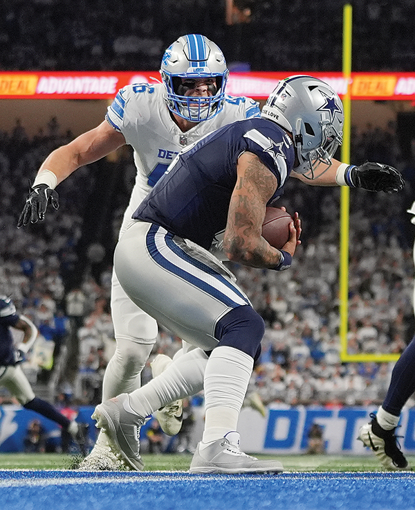 AP FILE PHOTO - Detroit Lions linebacker Jack Campbell, left, moves in to sack Dallas Cowboys quarterback Dak Prescott during the first half of an NFL football game Dec. 4, 2025, in Detroit.