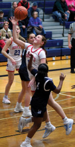 - T-R PHOTO BY ROSS THEDE – Marshalltown senior Millie Heitmann scoops in a layup during the first half of Friday’s Iowa Alliance Conference basketball game against Des Moines Roosevelt inside the Roundhouse. Heitmann had a team-high nine points in the Bobcats’ 45-26 loss.