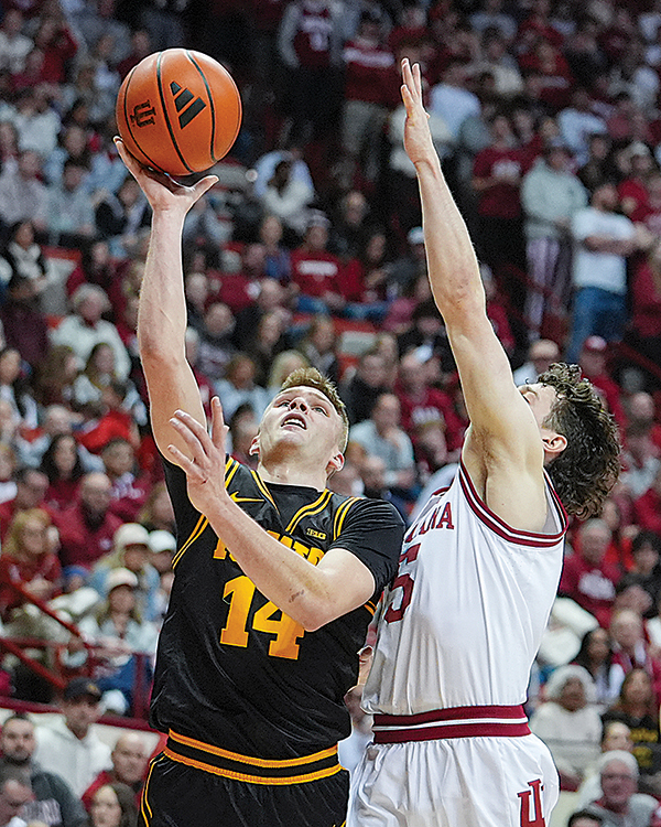 AP PHOTO - Iowa guard Bennett Stirtz (14) shoots over Indiana guard Conor Enright (5) in the first half of a Big Ten Conference basketball game in Bloomington, Ind., Saturday, Jan. 17, 2026.