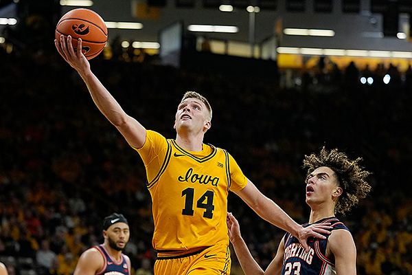 AP PHOTO - Iowa guard Bennett Stirtz (14) drives to the basket past Illinois guard Keaton Wagler (23) during the second half of a Big Ten Conference basketball game Sunday at Carver-Hawkeye Arena in Iowa City.