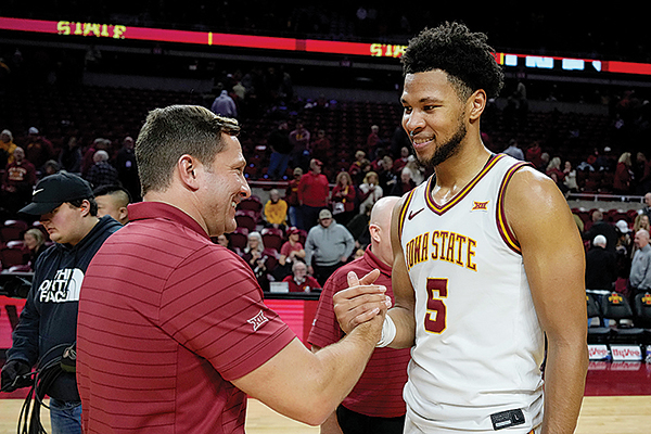 AP PHOTO - Iowa State head coach T.J. Otzelberger greets Joshua Jefferson (5) after Tuesday’s Big 12 Conference basketball game against UCF at Hilton Coliseum in Ames.