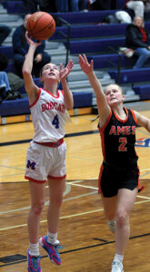 - T-R PHOTO BY ROSS THEDE – MHS guard Kendall Brummel (4) scores a layup in front of Ames defender Lyza Britten (2) during the first half of Tuesday’s game.