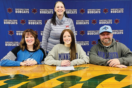 Marshalltown High School senior Kinsley Bowie, seated center, recently signed her National Letter of Intent to continue her volleyball career with Minnesota West Community & Technical College in Worthington, Minn. Bowie was a unanimous first-team all-Iowa Alliance Conference Northern Division selection as an outside hitter for MHS this past fall after leading the Bobcats with 1.9 kills per set. She was the only unanimous selection on the IAC first team. She was joined at her signing event by her parents Libby Brown, left, and Jim Bowie, right, and MHS head volleyball coach Jen O’Neal, standing.
