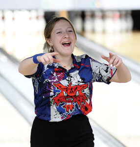 - T-R PHOTOS BY ROSS THEDE – Marshalltown junior Aubrey Webber celebrates after rolling a strike during Monday’s Baker games at the Class 3A Region 2 state-qualifying meet at Wayward Social.
