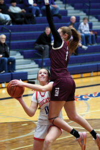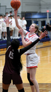 - T-R PHOTO BY ROSS THEDE – Marshalltown senior Millie Heitmann shoots over Des Moines Lincoln defender Jumi Kayode (15) during the first half of Wednesday’s Class 5A Region 3 first-round game at the Roundhouse.