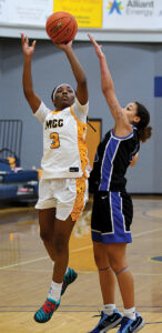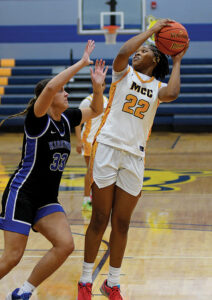 - T-R PHOTO BY ROSS THEDE – Marshalltown Community College sophomore Kenijae Cherry (22) readies to shoot over Kirkwood’s Kaci Crum during the first half of Wednesday’s basketball game at the Student Activity Center.