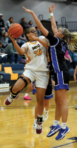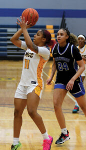 - T-R PHOTO BY ROSS THEDE – Marshalltown Community College sophomore Olivia Heartwell, left, looks for a path to pass around Kirkwood defender Molly Roling (14) during the first half of Wednesday’s basketball game at the Student Activity Center.