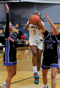 - T-R PHOTO BY ROSS THEDE – Marshalltown Community College sophomore guard Shenell Stewart (3) is fouled on her way to the basket between Kirkwood defenders Molly Roling (14) and Madison Stowater, left, during the first half of Wednesday’s basketball game at the Student Activity Center. Stewart had team-highs of 11 points, five steals and four assists in her MCC finale, an 81-35 loss to the sixth-ranked Eagles.