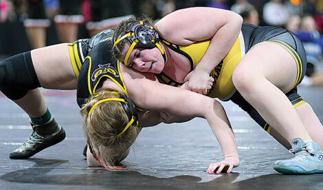 - T-R PHOTO BY ROSS THEDE – West Marshall sophomore Reese Buschbom, right, tries to turn Mid-Prairie’s Ellie Callahan to her back during their Class 1A 190-pound second-round consolation match on Thursday at Xtream Arena in Coralville.