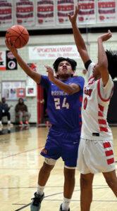- T-R PHOTO BY ROSS THEDE – Marshalltown freshman guard Damian Segovia (24) scores a layup and is fouled by Des Moines East’s D’Angelo Parker during the fourth quarter of Friday’s basketball game in Des Moines.