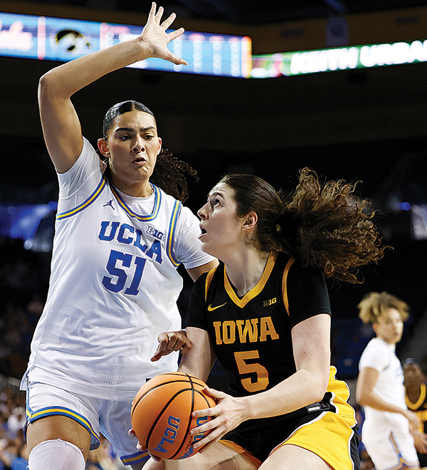 AP PHOTO - Iowa center Ava Heiden (5) drives against UCLA center Lauren Betts (51) during the first half of a Big Ten Conference basketball game Sunday in Los Angeles.