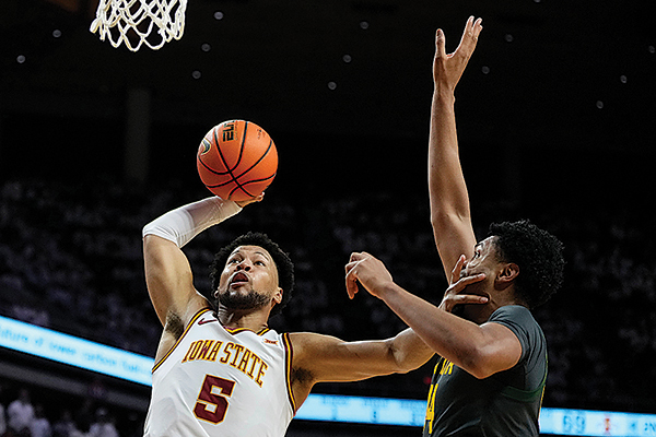 AP PHOTO - Iowa State forward Joshua Jefferson (5) is fouled by Baylor center Caden Powell, right, on his way to the basket during the second half of a Big 12 Conference basketball game Saturday at Hilton Coliseum in Ames.