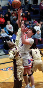 - T-R PHOTO BY ROSS THEDE – Marshalltown junior Jamison Niehouse shoots over Des Moines Lincoln defender Rico Mann during the first half of Tuesday’s Iowa Alliance Conference basketball game inside the Roundhouse.
