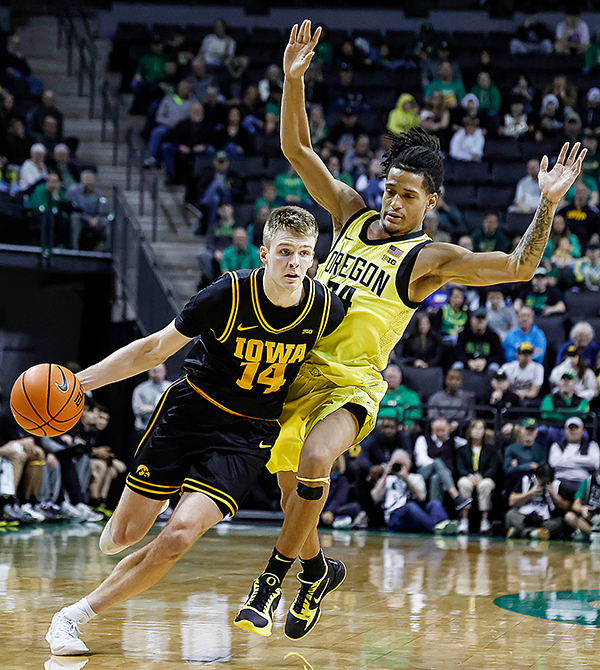 AP PHOTO - Iowa guard Bennett Stirtz (14) dribbles down court against Oregon guard Jamari Phillips in the second half of a Big Ten Conference basketball game Sunday in Eugene, Ore.