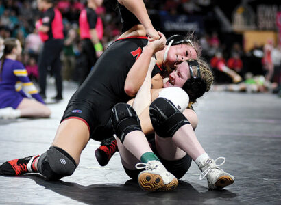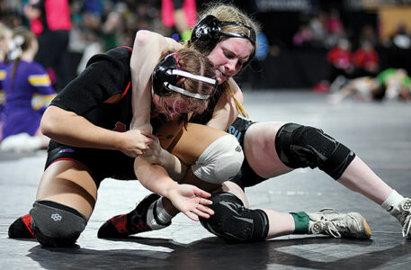 Taya, a three-time state qualifier, improved to 54-3 for her senior year with back-to-back pins at 155. She decked Carroll Kuemper’s Lucy Potthoff in 31 seconds, and then scored a pin over third-seeded Ryley Marcum of Missouri Valley in 4:59 to advance to Friday’s semifinals.