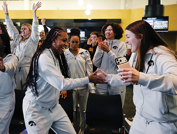 PHOTO COURTESY OF UNIVERSITY OF IOWA ATHLETICS - Iowa women’s basketball players Journey Houston, left, and Taylor Stremlow, right, share in the celebration after the Hawkeyes were announced as a No. 2 seed and a site host for the NCAA Women’s Tournament during Sunday’s selection show watch party inside Carver-Hawkeye Arena.