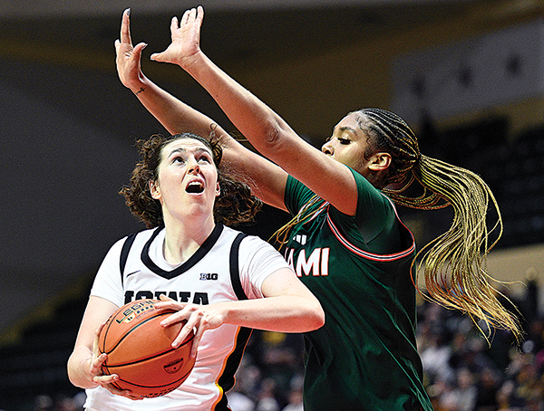 AP FILE PHOTO - Iowa center Ava Heiden, left, goes up to shoot against Miami center Ra Shaya Kyle during a college basketball game Nov. 22, 2025, in Kissimmee, Fla.