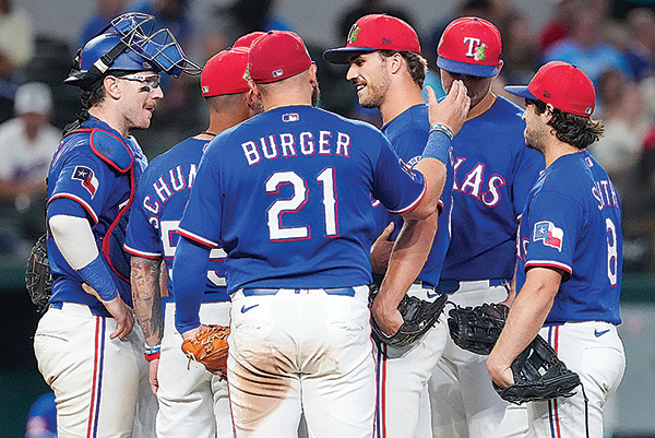 AP PHOTO BY SMILEY N. POOL/THE DALLAS MORNING NEWS - Texas Rangers pitcher Carter Baumler, third from right, gets a pat on the back from first baseman Jake Burger (21) as he gets a visit at the mound from manager Skip Schumaker to inform him he has made the Opening Day roster during the fifth inning of an exhibition baseball game against the Kansas City Royals on Monday, March 23, in Arlington, Texas.