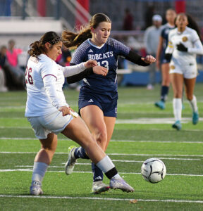 Leading 2-0, Marshalltown earned a throw-in in its offensive third, and Meraz’s pass mingled through the zone as a pair of Bobcats passed on the chance to play it. Bonzer received the bouncing ball, brought it to her right foot and turned to shoot a well-placed shot into the upper 90 from 19 yards away.