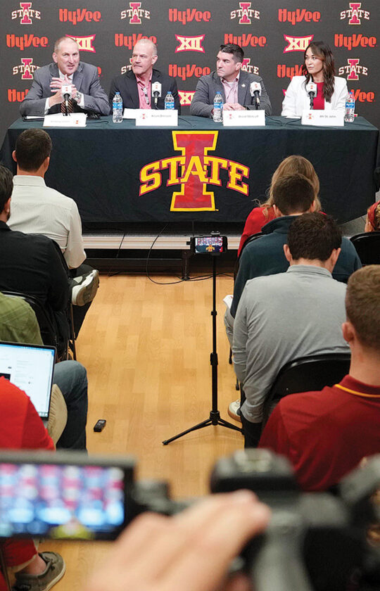PHOTO COURTESY OF IOWA STATE ATHLETICS - Iowa State athletic director Jamie Pollard, far left, speaks during a press conference Thursday in Ames announcing women’s wrestling as the school’s newest sport. The Cyclones moved head wrestling coach Kevin Dresser, second from left, to a newly created position as Director of Wrestling, promoted assistant coach Brent Metcalf, second from right, to head men’s wrestling coach, and introduced Alli St. John, far right, as the first women’s wrestling coach.