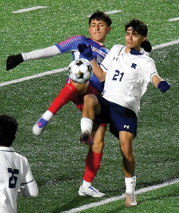 - T-R PHOTO BY ROSS THEDE – Marshalltown senior defender Jesus Maravilla Ordaz battles with Des Moines Roosevelt’s Jaime Rico (21) for possession of a throw-in during the first half of Tuesday’s Iowa Alliance Conference soccer match at Leonard Cole Field.