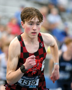 - T-R PHOTOS BY ROSS THEDE – Preston Johnson fires off the starting line for the 3,200-meter run on Thursday at Drake Stadium in Des Moines.