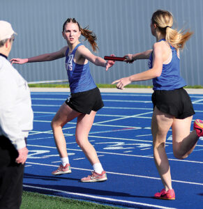 - T-R PHOTO BY ROSS THEDE – Marshalltown’s Kendall Brummel, right, completes the handoff to Mallory Meyeraan for the final exchange of the 4×800-meter relay on Monday at Leonard Cole Field. The quartet of Anessa Morrison, Drea Ceren, Brummel and Meyeraan took third in a season-best time of 10 minutes, 52.55 seconds.