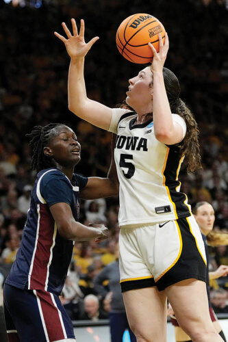 IOWA CITY — Ava Heiden scored a career-high 29 points, including 12 straight for Iowa in the fourth quarter, and the No. 2-seeded Hawkeyes survived an upset bid from 15th-seeded Fairleigh Dickinson with a 58-48 victory in an NCAA Tournament first-round game on Saturday.