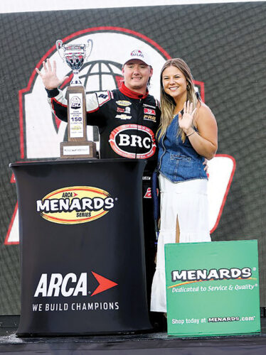 Brenden Queen and girlfriend Nicole Natchus pose with the winner’s trophy after taking the checkered flag at the ARCA Atlas 150 on Friday night at Iowa Speedway in Newton.
