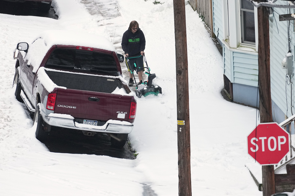 A person clears a sidewalk after a winter snow storm in Pottsville, Pa., Tuesday, Dec. 2, 2025. (AP Photo/Matt Rourke)